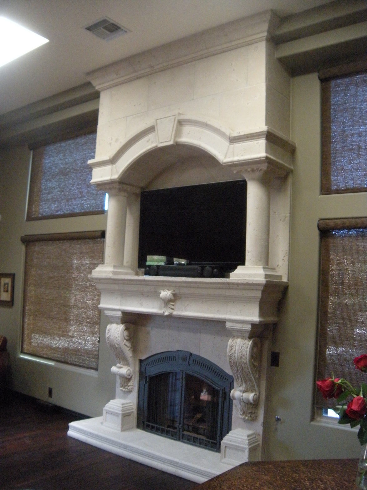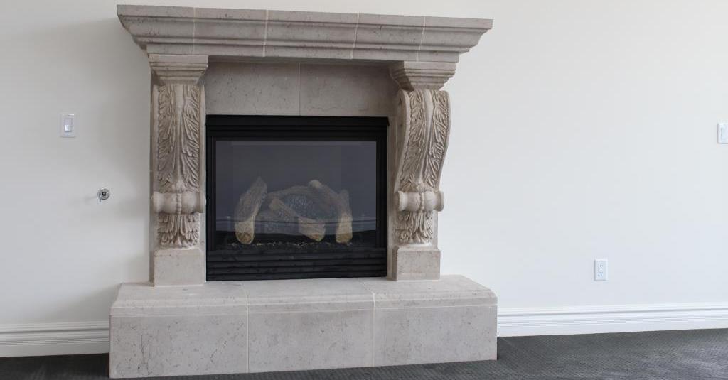 Mesa Precast | Ornate Fireplace with Graziella Corbel | Product Color: Oak Birch | Product Finish : Travartine Finish